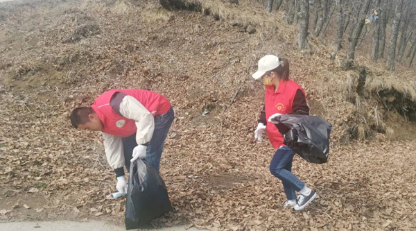大家自備手套、水靴、剪刀、袋子、皮繩等清掃工具,從石青山的山腳下開始,對環(huán)山路兩側(cè)的垃圾進(jìn)行全面清理、裝運。有的鉆入樹林,撿拾白色垃圾;有的摘除破損條幅,更換新貌;有的收堆、撐袋,將垃圾裝車運走。醒目的條幅標(biāo)語,飄揚的志愿服務(wù)隊隊旗,鮮紅的志愿者身影,忙碌的勞動場面,構(gòu)成了一幅五彩斑斕的畫卷。